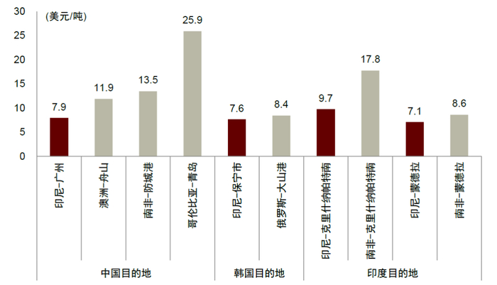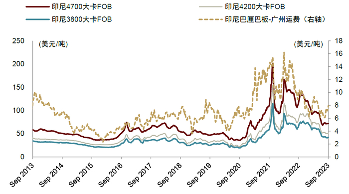 海运成本具备优势。印尼出口煤炭的优势不仅体现在生产成本相对低,其向亚太主要消费市场出口的海运成本也低于澳大利亚、俄罗斯、南非、哥伦比亚等其他出口国。此外,在煤价走弱下,虽然运费可能也会因煤炭供求关系变化而下跌,但由于运费存在一定刚性,煤炭海运成本占优的印尼在煤价下行时期也具备更强的韧性。