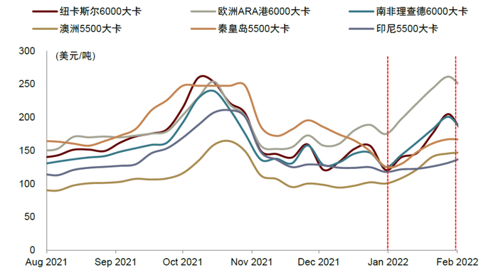 图表37:2022年1月,除了印尼煤炭报价相对平稳外,其他主要地区煤炭报价出现不同程度上涨