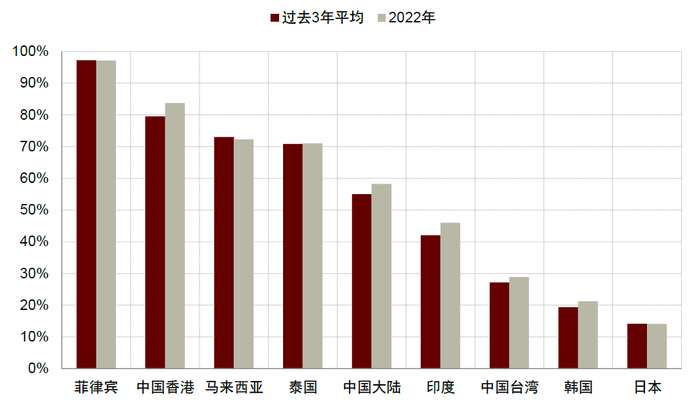 东南亚地区、中国大陆及香港地区、印度对印尼煤炭的依赖度相对较高。根据IHS McCloskey,在印尼出口煤主要流向地区中,2022年菲律宾对印尼煤的进口依赖度较高,印尼煤炭进口量占当地总进口量的比重超过95%,中国香港、马来西亚和泰国对印尼煤的进口依赖度也超过了70%,中国大陆和印度对印尼煤的进口依赖度达到5-6成左右,印尼煤进口占比相对低的主要是中国台湾、日本和韩国,依赖度在10-30%之间。
