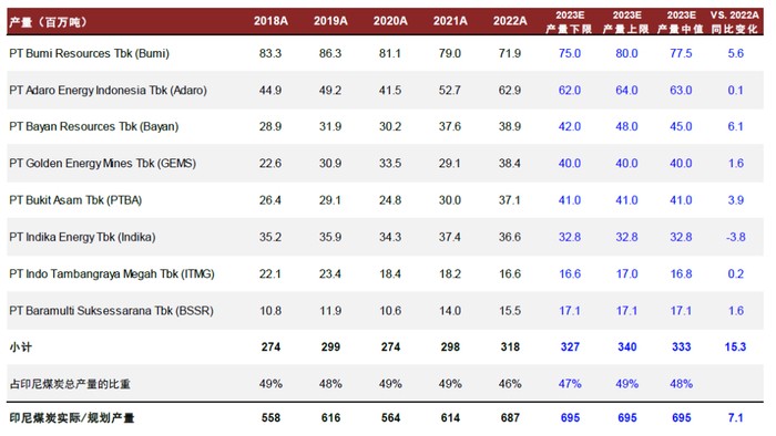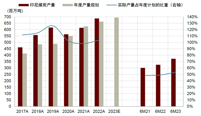 短期来看,印尼煤炭供给将进一步增加。根据印尼能矿部[4],2023年该国计划生产煤炭6.95亿吨(vs. 2022年实际产量6.87亿吨)。考虑到过去几年印尼煤炭实际产量一般高于目标产量,我们认为2023年该国煤炭产量有望实现年初制定的目标。此外,我们通过梳理印尼主要煤企的生产计划,也可以看出多数企业计划在2023年进一步提升产量。同时,今年以来印尼的产量情况也反映出2023年实现全年目标存在较高可能性,1H23印尼累计产量同比增加14%至3.72亿吨,已实现全年目标产量的54%。