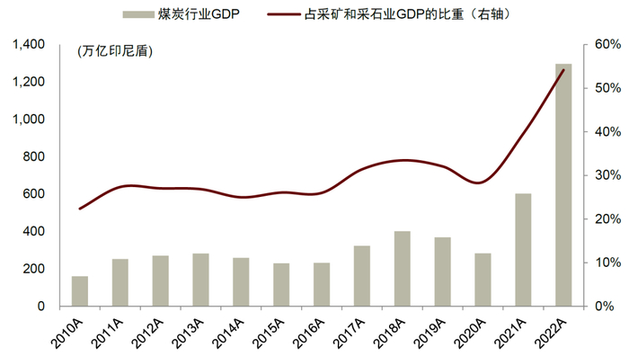 煤炭行业是印尼GDP的重要组成部分。从现价GDP分行业构成情况来看,过去10年采矿业占印尼GDP的比重在10-15%左右,其中煤炭行业占采矿业GDP的比重一般在20-30%左右。2021-2022年,由于全球煤价上涨和印尼煤炭产量增加,煤炭行业占印尼采矿业GDP的比重进一步提升,占比分别达到了40%、54%,创10年来的高点。