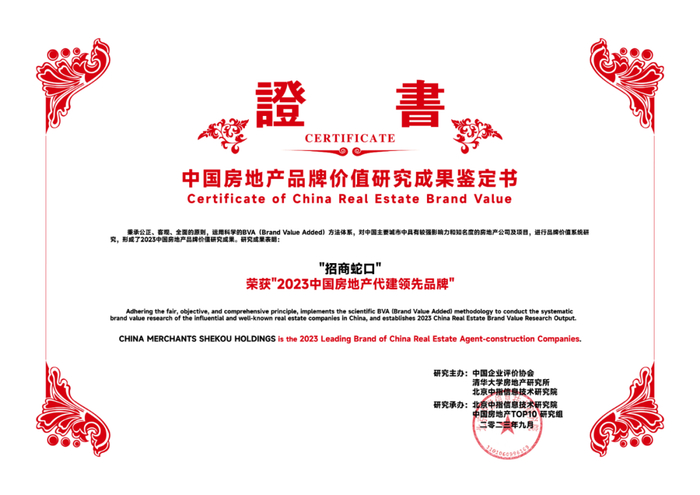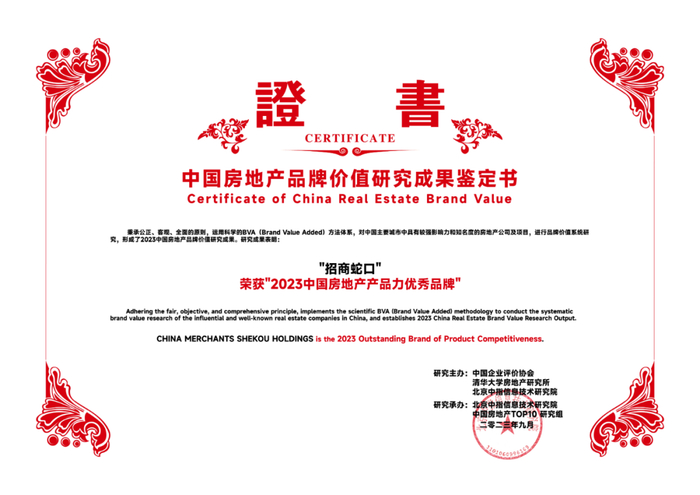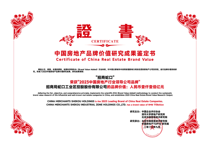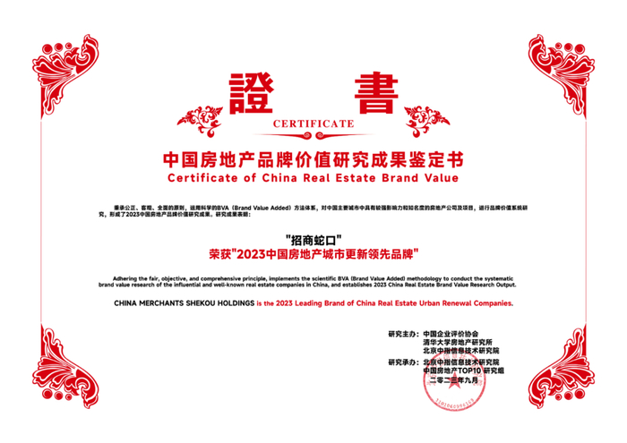 招商蛇口凭借可持续稳健发展理念、持续提升的产品力、行业领先的品牌影响力、多元化业务发展,荣获“2023中国房地产行业领导公司品牌”、“2023中国房地产产品力优秀品牌”、“2023中国房地产代建领先品牌”和“2023中国房地产城市更新领先品牌”等多项殊荣,品牌价值高达1100亿元人民币。