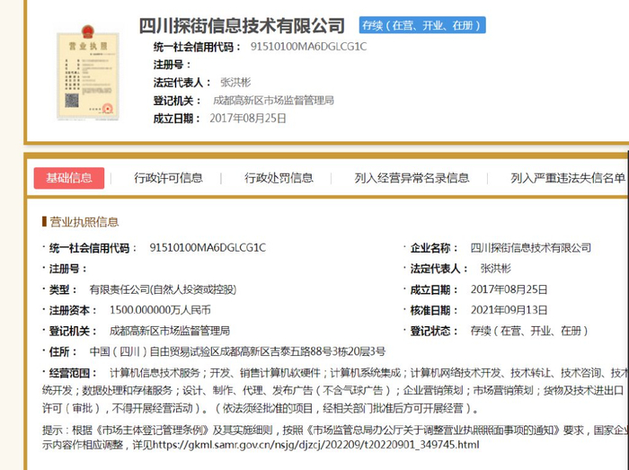 据查,四川探街公司于2017年8月25日成立,注册资本1500万元,法人代表为张洪彬,目前公司状态显示为存续。