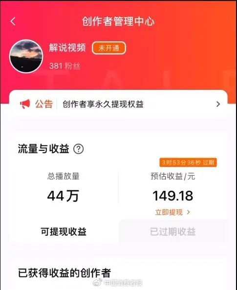 庄先生的“解说视频”账号显示有粉丝381个,点赞1680个。“创作者管理中心”页面显示总播放量和预估收益的同时,还会告知“提现有效期”。页面上方“创作者享永久提现收益”的公告,让庄先生误以为点击“立即提现”就可以即时到账。