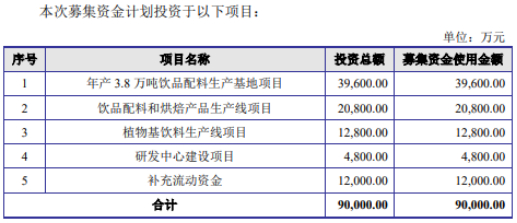 本次,德馨食品拟募集9亿资金,其中3.96亿用于投入年产3.8万吨饮品配料生产基地项目,2.08亿用于投入饮品配料和烘焙产品生产线项目,1.28亿用于投入植物基饮料生产线项目,4800万用于投入研发中心建设项目,1.2亿用于补充流动资金。