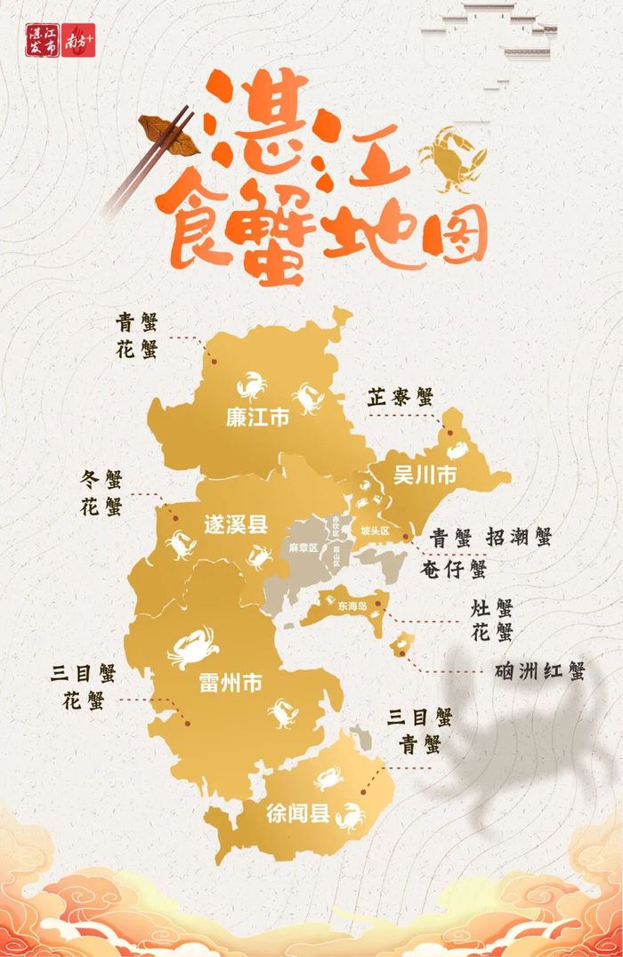 湛江海岸线漫长,海域广阔,滩涂众多,是蟹的良好栖身之地,孕养出种类繁多的海蟹:黄油蟹、青蟹、花蟹、奄仔蟹、芷寮蟹、冬蟹等,以腿粗肉厚、膏满脂丰而著称。