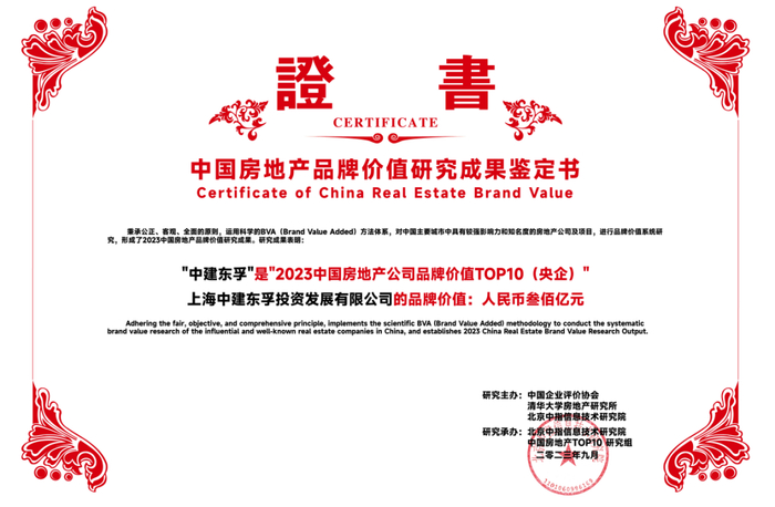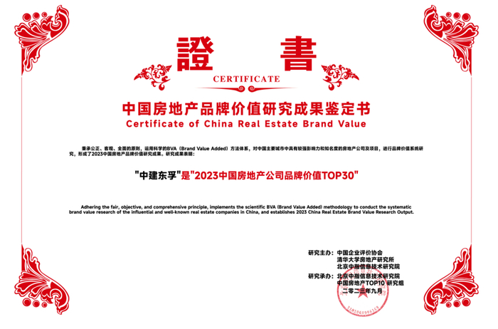 2023年9月14日,由中国企业评价协会、清华大学房地产研究所、北京中指信息技术研究院主办,北京中指信息技术研究院中国房地产TOP10研究组承办的“2023中国房地产品牌价值研究成果发布会暨第二十届中国房地产品牌发展论坛”在北京隆重召开。其中中建东孚荣获“2023中国房地产公司品牌价值TOP30”、“2023中国房地产公司品牌价值TOP10(央企)”殊荣。