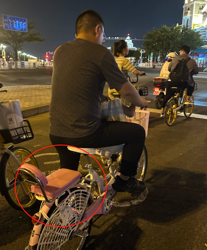 不仅如此,有些人在租车时对于车辆也存在不实宣传。采访中,有提供租车者指着前后都装有座椅的亲子车,告诉记者“可以一个大人带两个小孩”。实际上,《北京市实施〈中华人民共和国道路交通安全法〉办法》规定,成年人驾驶自行车可以在固定座椅内载一名儿童。
