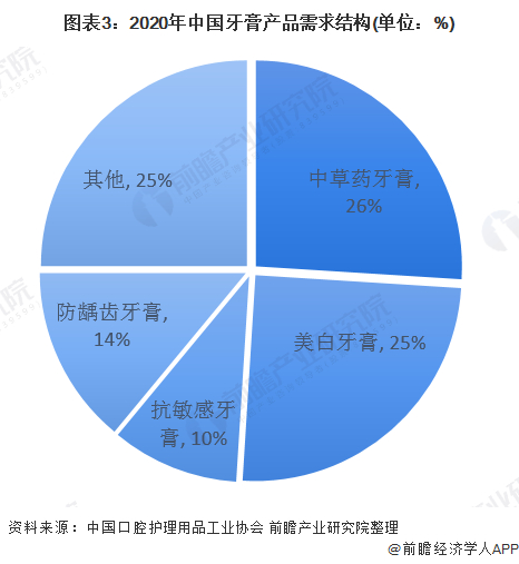 据中国口腔护理用品工业协会,2020年规模以上牙膏生产企业销售收入约265亿元人民币,功效型产品市场份额已占94%,从产品功效看,美白、中草药品类牙膏仍然是主要诉求,中药植物成分的牙膏份额达26%,美白类牙膏市场份额达25%,抗敏感牙膏市场份额达10%; 特色明显的产品市场拓展加快。
