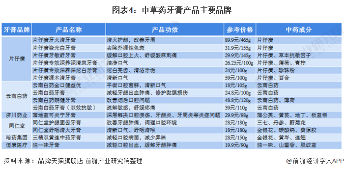 中草药牙膏产品有片仔癀、云南白药、济川药业、同仁堂、哈药集团、恒康医疗等。从价格来看,片仔癀牙膏定位为超高端市场,且基本款产品(牙火清牙膏)价格在同类型中草药牙膏基本款中处于中部;