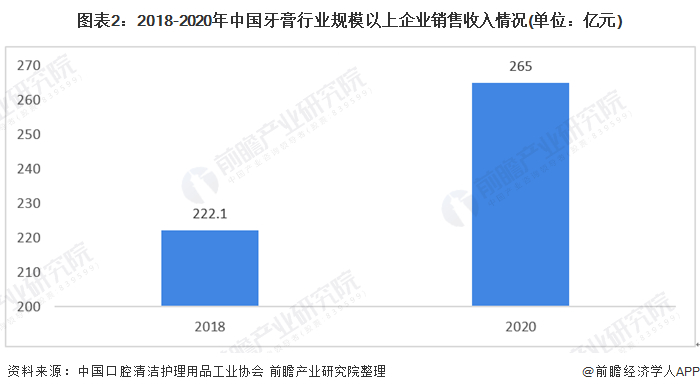 受健康意识提升及消费观念转变,消费者越来越重视口腔护理,从而带动牙膏市场的快速发展。据中国口腔清洁护理用品工业协会行业数据,2020年我国牙膏行业规模以上企业销售收入约265亿元。