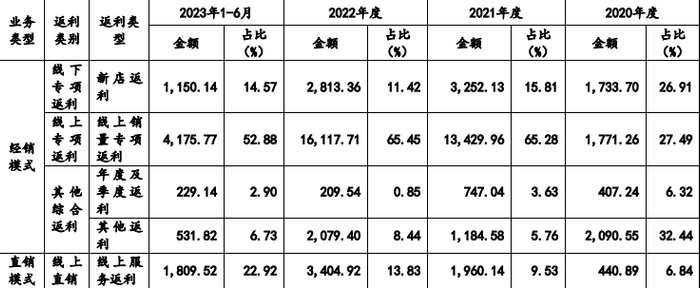 而以上返利项目均属于经销模式,通过数据可以发现,通过经销数据的返利金额占返利总金额的比例常年在8成左右。