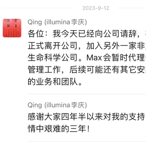 一份聊天记录截图显示,李庆在9月12日傍晚的发言中表示,“我今天已经向公司请辞,在一个月后正式离开公司,加入另外一家非竞争的美国生命科学公司”、“感谢大家四年半以来对我的支持,尤其是疫情中艰难的三年!”。