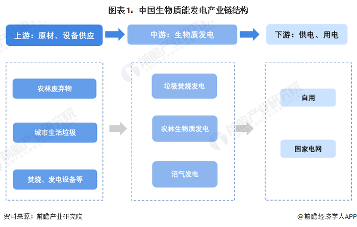 生物质发电的上游主要为生物质原料供应商、焚烧设备、发电设备供应商等;中游为生物质发电企业,包括垃圾焚烧发电企业、农林生物质发电企业以及沼气发电企业;下游为国家电网等供电机构,或是企业/用户自用。
