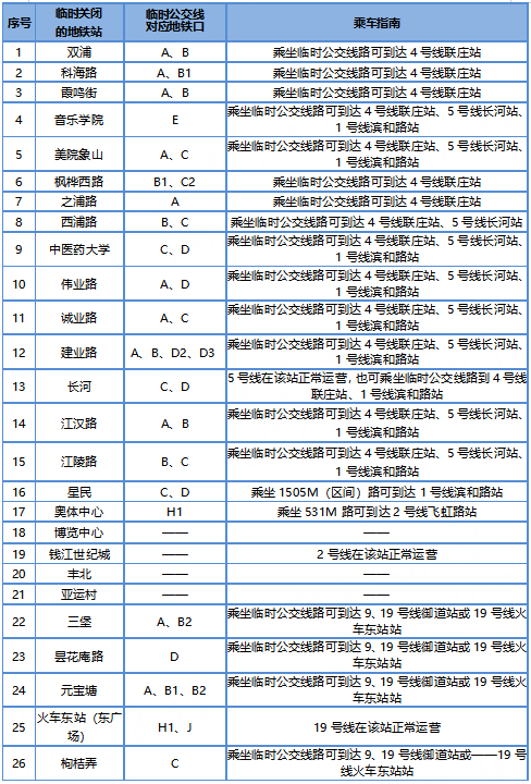 1号线江陵路站、4号线中医药大学站、7号线奥体中心站、9号线三堡站暂停运营;