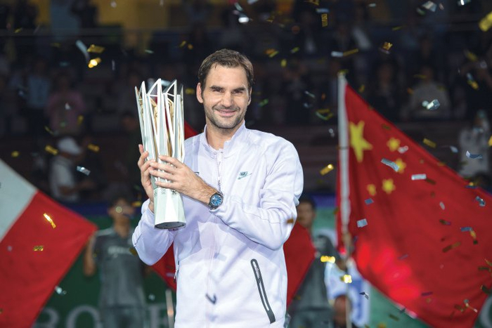 劳力士代言人罗杰·费德勒在2017年上海劳力士大师赛夺冠后手捧奖杯 ©Rolex/Jon Buckle