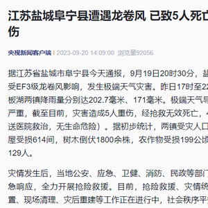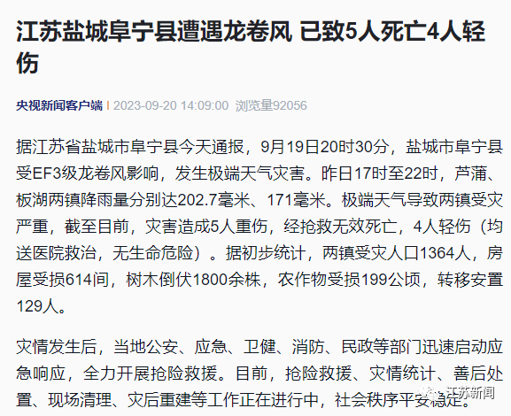 据江苏省盐城市阜宁县今天通报,9月19日20时30分,盐城市阜宁县受EF3级龙卷风影响,发生极端天气灾害。昨日17时至22时,芦蒲、板湖两镇降雨量分别达202.7毫米、171毫米。极端天气导致两镇受灾严重,截至目前,灾害造成5人重伤,经抢救无效死亡,4人轻伤(均送医院救治,无生命危险)。据初步统计,两镇受灾人口1364人,房屋受损614间,树木倒伏1800余株,农作物受损199公顷,转移安置129人。