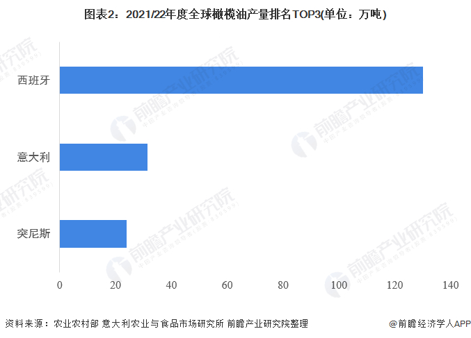 根据数据显示,2021/2022年,西班牙橄榄油产量预计为130万吨,同比减少7%,但仍排名世界第一位。意大利紧随其后,产量为31.5万吨,同比增长15%。突尼斯反超希腊排名第三位,产量为24万吨,同比增长71%。