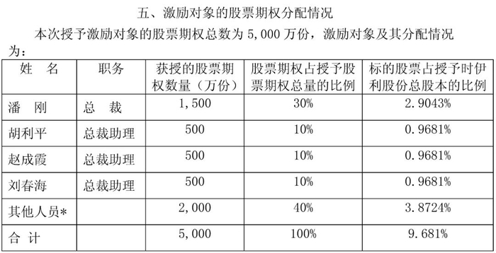 2006年,伊利股份授予公司高管和核心业务骨干5000万份股票期权,8年内行权价格13.33元/股。潘刚获得股票期权数量为1500万份,其他高管及核心业务骨干共29人包揽余下股票期权。