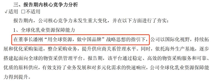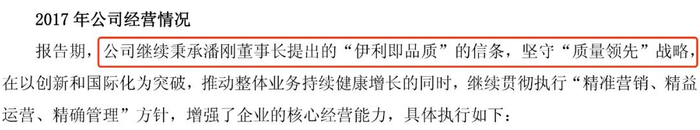在某些年份的伊利集团财报中,都会出现 “继续贯彻”潘刚提出的战略, “在董事长潘刚用全球资源,做中国品牌战略思想的指引下”,“公司秉承董事长潘刚提出的伊利即品质的信条”等等。