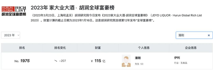 今年3月份发布的《 胡润全球富豪榜》显示,潘刚以115亿元财富,位列该榜单第1975名。