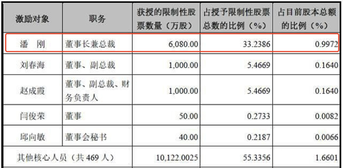 2019年8月5日,伊利股份向激励对象授予公司限制性股票总计1.83亿股,价格为15.46元/股,为公司当天市场价30元每股的近一半价格。其中潘刚获授6080万股,占授予限制性股票总数的33.2386%。