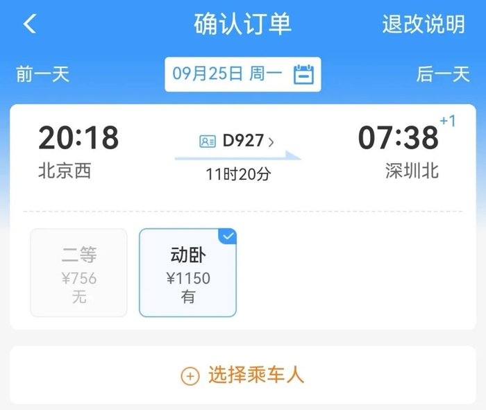 近日,有网友在社交媒体发文称,北京到深圳的D927卧铺,上铺平日1150元,但在9月28日(国庆假期前一日)价格涨到1860元,下铺动卧价格达到了2090元,超过了当日的机票价。