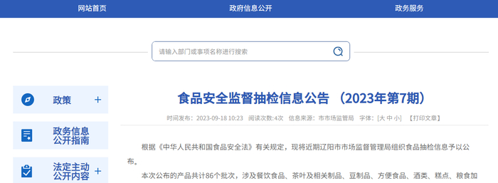 辽宁省辽阳市市场监管局抽检食品86批次均合格