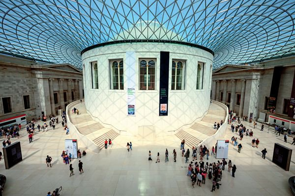 大英博物馆中央大厅。中间的圆柱形建筑曾作为大英博物馆阅览室对公众开放,如今仅在馆内有特展或特定时间偶尔开放。