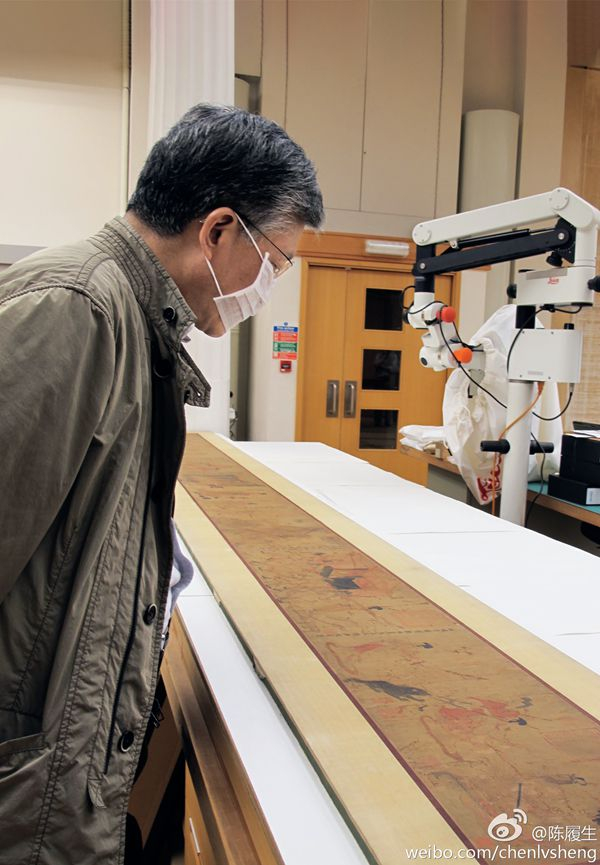 2011年9月,陈履生在大英博物馆书画修复室首次见到《女史箴图》唐摹本。(陈履生供图)