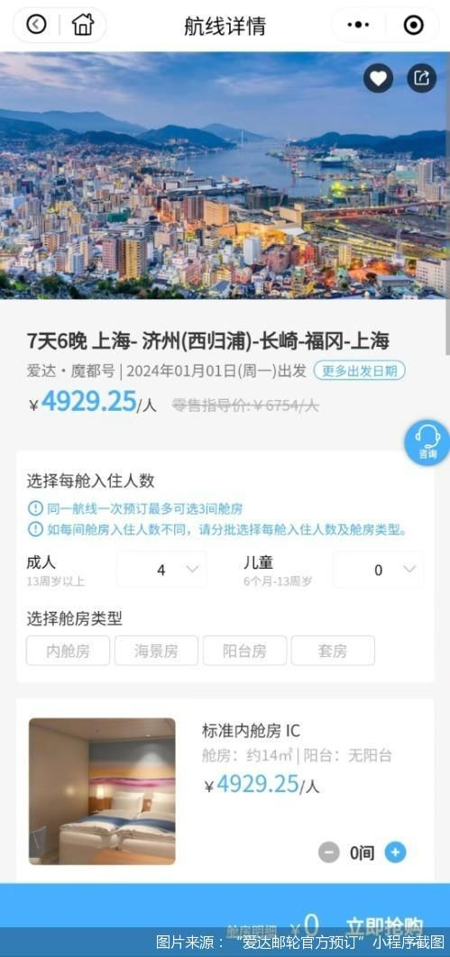 据“爱达邮轮官方预订”小程序,在爱达·魔都号首航航线产品“7天6晚 上海-济州(西归浦)-长崎-福冈-上海”中,按每舱入住人数为1成人1儿童来看,全景套房S售价为10419元/人。