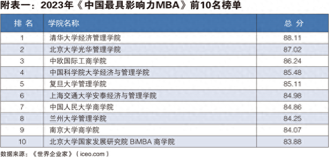 扬子晚报网9月20日讯(记者 马燕)9月20日,世界经理人集团、《世界企业家》杂志联合编制的2023年(第二十一届) “中国最具影响力MBA排行榜”在香港发布,清华大学经济管理学院、北京大学光华管理学院、中欧国际工商学院、中国科学院大学经济与管理学院、复旦大学管理学院列前五。南京大学商学院位居第九。