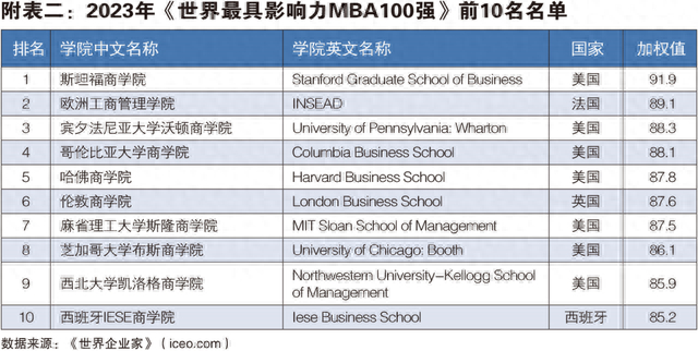 《世界企业家》杂志同期发布了2023年“世界最具影响力MBA100强”排行榜,斯坦福商学院、欧洲工商管理学院、宾夕法尼亚大学沃顿商学院排名前三。