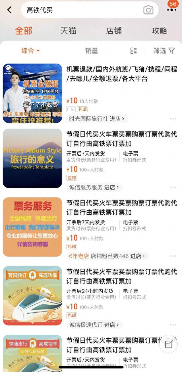 在某平台搜索“高铁代买”,出现许多商家明确写明提供火车票代抢服务,且都显示“100人+付款”。记者联系了其中一家销量不错,开了6年的老店,对方表示代抢费为100元,有的热门线路,为了增大成功率,需要增加购买从始发站发出的班次。例如想要购买“南京到武汉”高铁票,卖家会帮助抢购“上海到武汉”的高铁票。也就是说,通过这种方式抢票成功,要比平常多花约230元。
