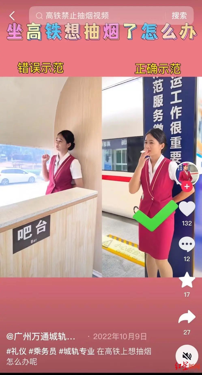 视频里,一名身穿高铁乘务员工作服的年轻女性,演示着在高铁车厢内和吧台处吸烟(以卷纸代替香烟)的错误行为,并进行了列车停站后前往站台吸烟区抽烟的正确示范。同时,视频中还给出了正确示范的文字提示:停站下车时,到吸烟区抽烟。