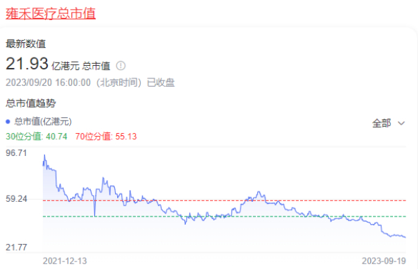 另一方面,雍禾医疗2021年12月上市之初,市值为90.68亿港元,2023年9月20日,雍禾医疗总市值为21.93亿港元。
