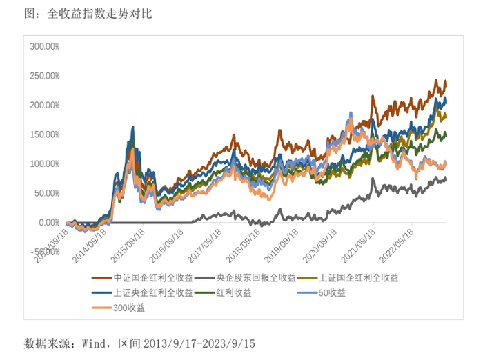 过去十年,中证国企红利全收益指数的累计收益率达到230%,显著高于同期的上证50全收益、沪深300全收益、红利收益及同类央/国企红利全收益指数。