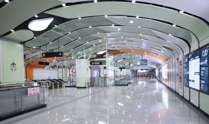 西安地铁1号线三期全线车站装修设计构思结合秦代建筑和历史文脉,选取秦代元素符号,形成“山水风宇、陵波飞檐”的设计理念,叠加竹简、小篆、青鹞、玄鸟的动势意象,在空间中形成从两侧墙向顶部中央由实到虚的过渡。各车站装修结合所处城市区域的环境风貌,文化底蕴和区域色彩,进行抽象表达,以“点、线、面”的手法,融入至西安轨道交通网络之中。