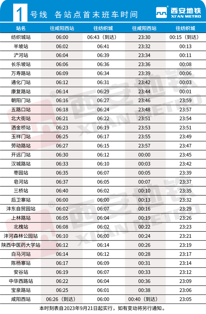 西安地铁1号线三期开通后与既有1号线贯通运营,全线首班车采用多点发车方式,其中纺织城方向首班车分别由咸阳西站、沣河森林公园、后卫寨三个车站发出,发车时间均为06:00;往咸阳西站方向首班车分别由纺织城、后卫寨两个车站发出,发车时间均为06:00。纺织城站开往咸阳西站方向末班车发车时间为23:30,咸阳西站开往纺织城站方向末班车发车时间为23:05。
