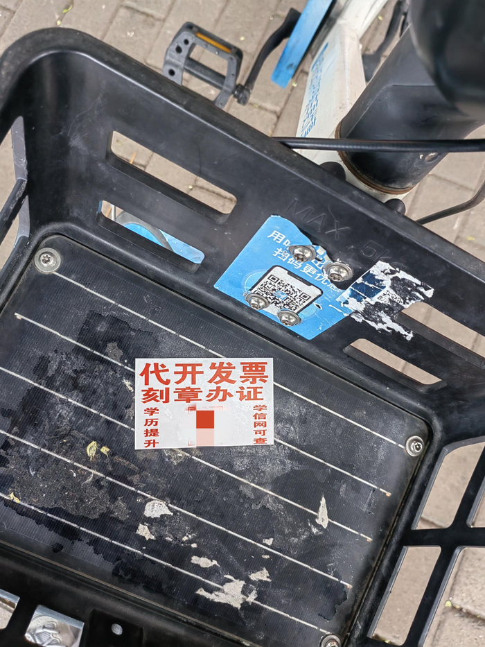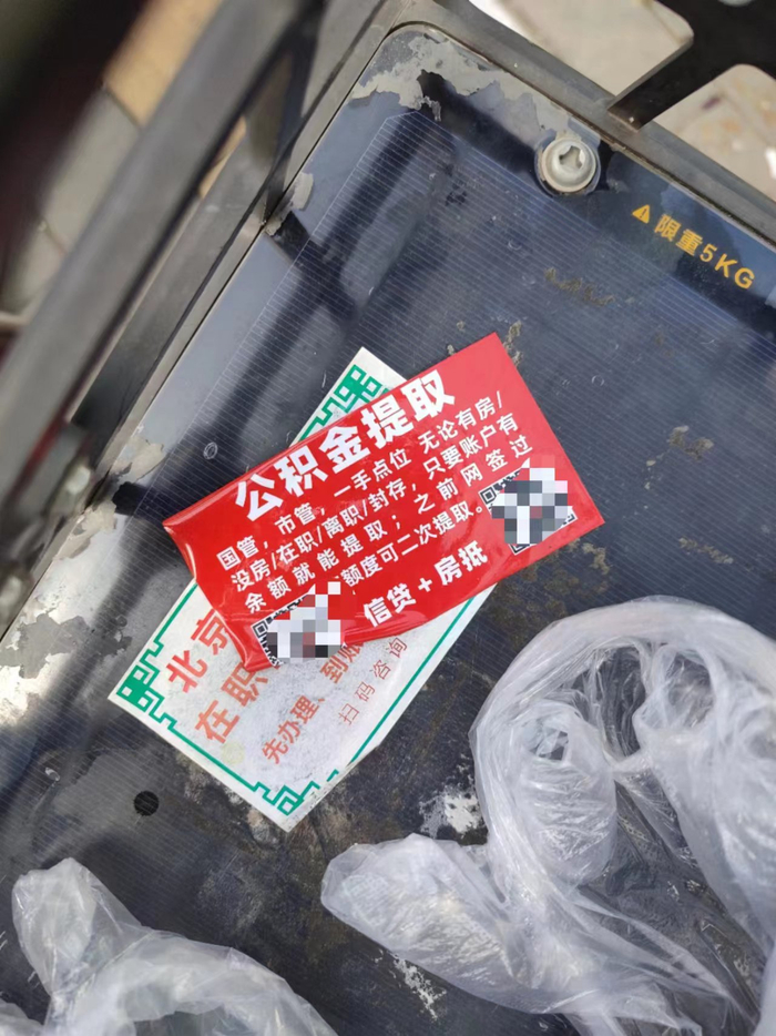然而,街头上的非法小广告,则呈现出另外的特点——不仅可以提供的业务内容多,也更具有较强的地段和载体集中性。比如,从广告内容上看,街头路边的非法小广告以刻章办证、公积金取现、代开发票、信用贷款等小广告为主。从广告出现的场景来看,在车流人流密集或者商业中心周边的街道地面,以及流动性较强的共享单车上,非法小广告出现的频率比较明显。