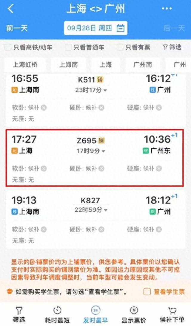 9月14日车票开售当天,9月28日晚从上海出发的3趟卧铺车车票全部秒光,三个家庭连一张票都没有抢到。其中,从上海站出发的一趟车时间最短,更是连候补席位都已满。“铁路部门不是一直倡导我们用候补功能嘛,结果是连候补的机会都没有,不但车票秒光,连候补席位都秒光。”同行的曹先生感叹道。