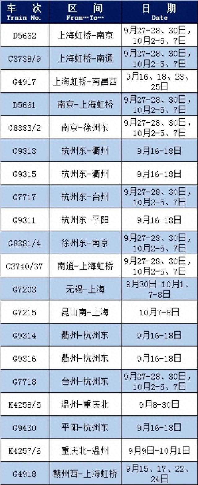 针对此次出行高峰,铁路部门已经增开了列车,包括9月27日-28日、9月30日、10月2日-5日以及7日增开上海虹桥至南京的D5662次,9月27日、28日、30日以及10月2-5日、7日增开上海虹桥至南通C3738/9次等。