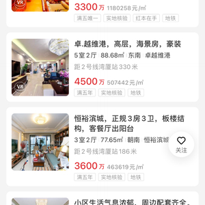 记者查询乐有家APP发现,以单价降序排名,一批高价房源已经不再显示参考价,单价最高甚至超过百万元。著名豪宅恒裕滨城一个挂盘价,高达463619元/平,高居单价榜第四位。而此前,恒裕滨城一期及二期的参考单价为116000元和132000元。