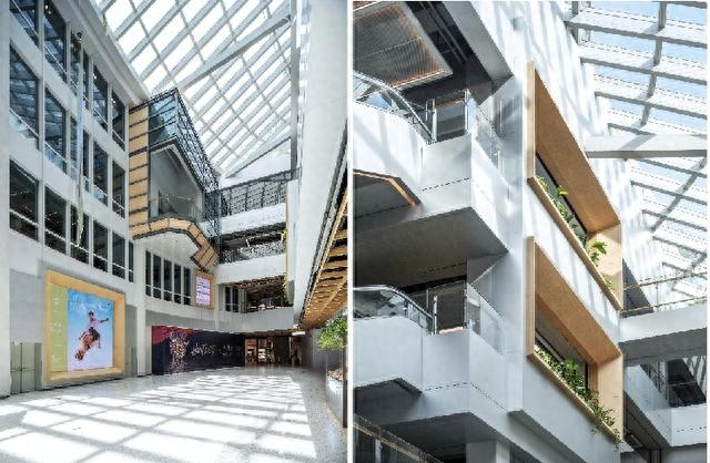 建设方介绍,“合集”牺牲了部分经营面积,打破了商业与办公空间的传统隔离,让人与空间的关系更加紧密。如,在一层挑高四层的中庭引入了自然天光,打造出“光合中庭”的效果;在三层设打造了配备“舞台式”室内露台的多媒体空间 ;二层至三层之间设计了“互动连桥”,以中国江南的古桥为灵感,串联起了“合集”商业、办公、自然等三大功能空间。