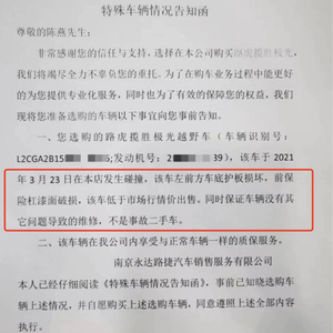 根据翟先生提供的《特殊车辆情况告知函》,其中明确称“您选购的路虎揽胜极光越野车于2021年3月23日在本店发生碰撞,该车左前方车底护板损坏,前保险杠漆面破损,该车低于市场行情价出售,同时保证车辆没有其他问题导致的维修,不是事故二手车。”在提车后,5月2日原厂更换件到货后,翟先生收到通知前往4S店进行了维修和更换。