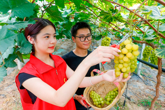 9月20日,黄山学院教育科学学院的大学生走进安徽省黄山市屯溪区黎阳镇新江村葡萄园,开展社会实践活动,通过线上直播带货、创意视频等形式,提升当地农产品知名度,帮助果农拓宽销售渠道,提高经济收入,助力乡村振兴。图为黄山学院的大学生(左)帮助果农采摘葡萄。(图片由CNSPHOTO提供)