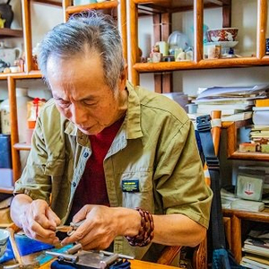 他把锔瓷和篆刻的手艺与国学艺术相结合,一只青花龙凤纹压手杯的杯口磨损了,他不仅包了整齐的银边,还在银坯上雕了细细的卷云纹。修缮的器物也不再局限于瓷器,千奇百怪什么都有,小到一枚玉扳指,大到一张木条案,都在他的修缮后重获新生,有时物件太大无法搬到工作室,他就提前准备好物品上门去修,甚至还曾有朋友邀请他去故宫修扇子。“现在的锔瓷更多的是秀活,人们更加追求瓷器的美感和艺术性,所以光有锔瓷的技术是不够的,以刻瓷为例,既要有锔活的基础,还要有古纹饰的常识,还要有绘画的常识,不一定精通,但是一定要懂一点,这样在修古玩的时候才能选到合适的式样和材质,修好之后让人觉得相得益彰,甚至更有艺术价值。”刘老师说,篆刻、锔瓷、书画、玉石都属于国学的范畴,可以触类旁通,有锔瓷的底子,会想到很多办法,比如修扳指,他用的就是修茶壶的内包口的办法,从里边向外修,在扳指内侧打个银环,给它撑起来,就不会影响外侧的美感。“一旦撞进来,天地很宽。”说起瓷和陶的不同烧成温度,他张口即来,谈到雕刻印章的各种石材他熟稔于心,提及玉石翡翠的不同特点他更是门清。“接触的多了,眼光手感就都练出来了,材质我不会认错,新老可是说不准。”他诚恳地说。