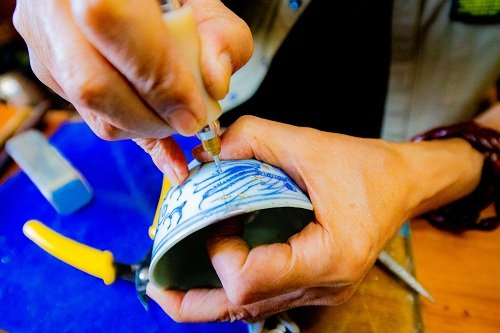 瓷器钉好后一般就不会漏水了,但是如果原有的缝隙比较大,就还是有漏的可能,如果是这种情况,刘老师在上钉之前就会用蛋清或者蛋清调糯米粉刷在缝隙处,然后再对好缝隙上钉,钉完之后如果还渗水,就往瓷器里装上米汤或牛奶,搁冰箱里放一天,这样就不会再漏水了。“以前抹缝都是用麻油调石灰,现在大家都讲究实用器皿的安全性,所以我们就改良了,用这些可以直接入口的材料,大家更放心。”