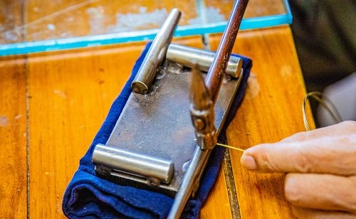 既然是秀活,就要把锔瓷做细做美,对此,刘老师很用心。他现在用的工具不再是以前的牙机,而是雕刻翡翠用的小电钻,孔径只有不足一毫米,而且还准备了各种规格款式。铜钉的钉孔和钉背成外八字,靠着钉背和两个钉孔之间距离的差距让钉子吃住劲儿,打孔的时候不能穿破瓷器,还得能缚住瓷器,讲究的是一个寸劲儿,靠的是多年积累的经验和手感。为了保持手感,即使哪天不用做秀活,刘老师也会专门上手在瓷器上打几个钉,为的就是保持手感。