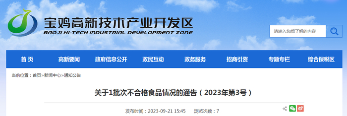 陕西省宝鸡市市场监督管理局高新分局关于1批次不合格食品情况的通告(2023年第3号)
